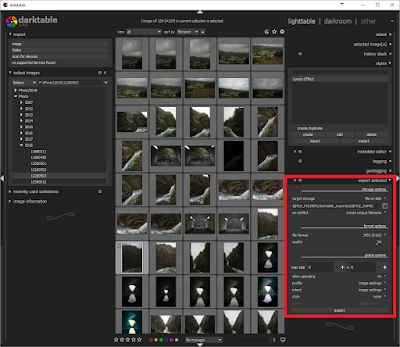 Lightroomインターフェースに切り替えます。現像したい画像を選択し、画面右側の"export selected"を開き、“storage options”、“format options”、"global options"を設定したら、exportボタンを押せば指定したフォルダーに出力できます。